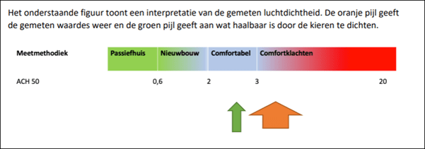 De n50-waarde liep in de gemeten appartementen van 2,9 tot 4,7 1/h. De n50-waarde geeft aan hoe vaak de lucht in een woning per uur wordt ververst bij een drukverschil van 50 Pascal, wat overeenkomt met windkracht 5. Dennis van Erp van de Kierenjagers: “Adviesbureau Nieman noemt voor renovatie een streefwaarde van de Qv10 van 0,7 [dm³/sm2] of lager. Dat komt overeen met een n50-waarde van 3,0 [1/h]. We hebben dus luchtdichtheidswaarde gemeten die redelijk zijn. Er is met kitwerk binnen winst te behalen waarmee zowel energiewinst als comfortwinst te behalen is.”