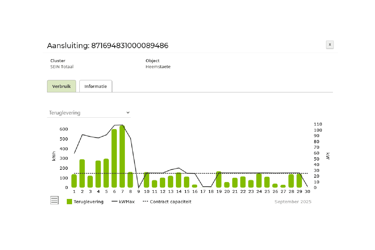 De locatie had niet alleen overschrijding van de ATO op levering maar ook op teruglevering, tot een factor vijf zelfs. Met de ‘SMA Datamanager M’ wordt nu de opbrengst van de PV-installatie (sinds 2018 aanwezig) afgeschaald om binnen de contractwaarde te blijven.