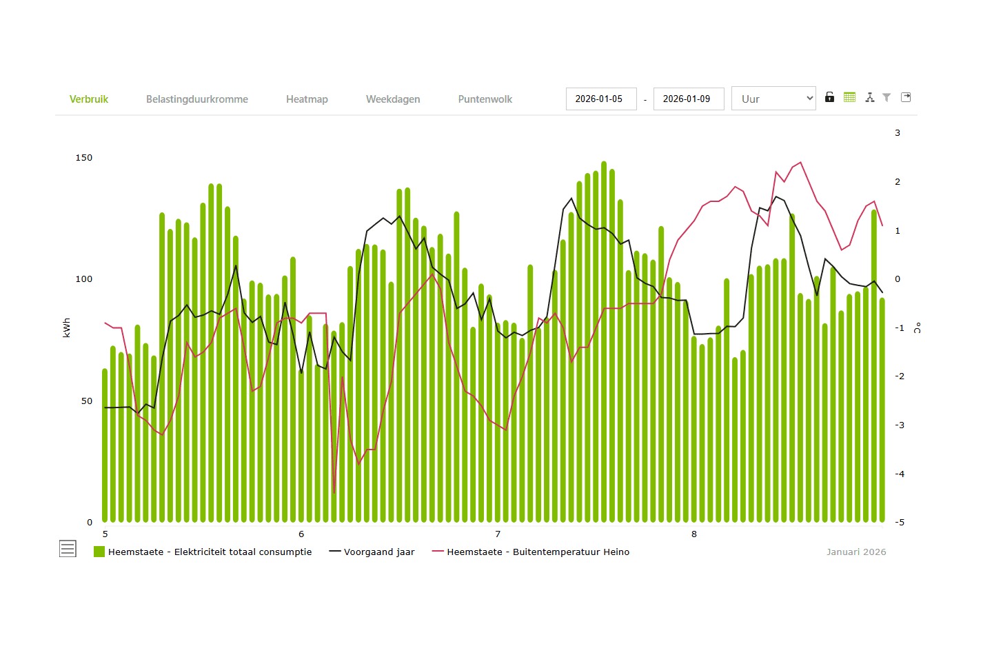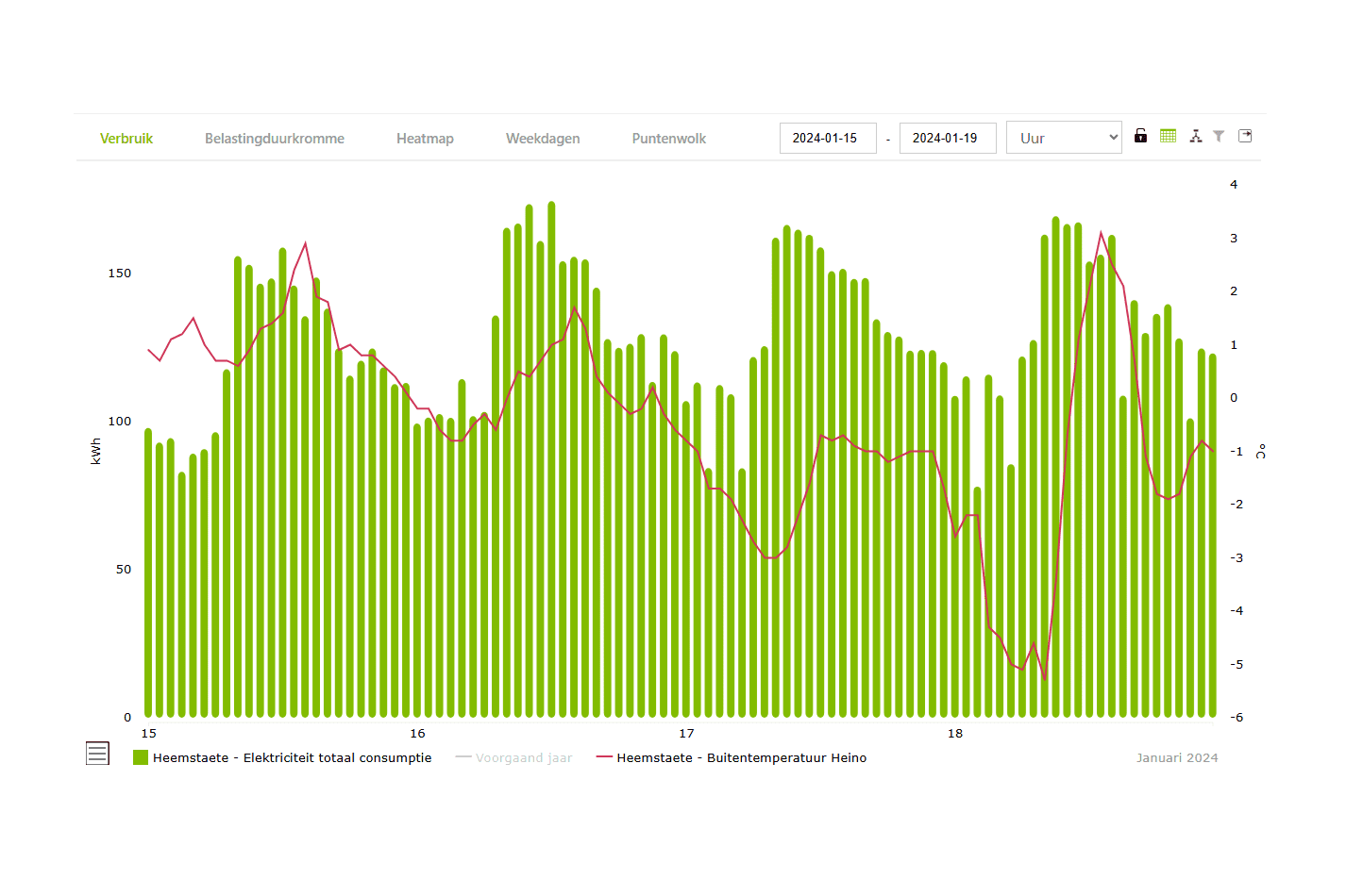 De rode lijn is de buitentemperatuur. Het was meerdere dagen tussen 0 ˚C en min 5 ˚C. De groene staven zijn het verbruik per uur. De basislast is rond 75 kW, de pieklast maximaal 150 kW. Het verbruik was gemiddeld 2.600 kWh per dag.