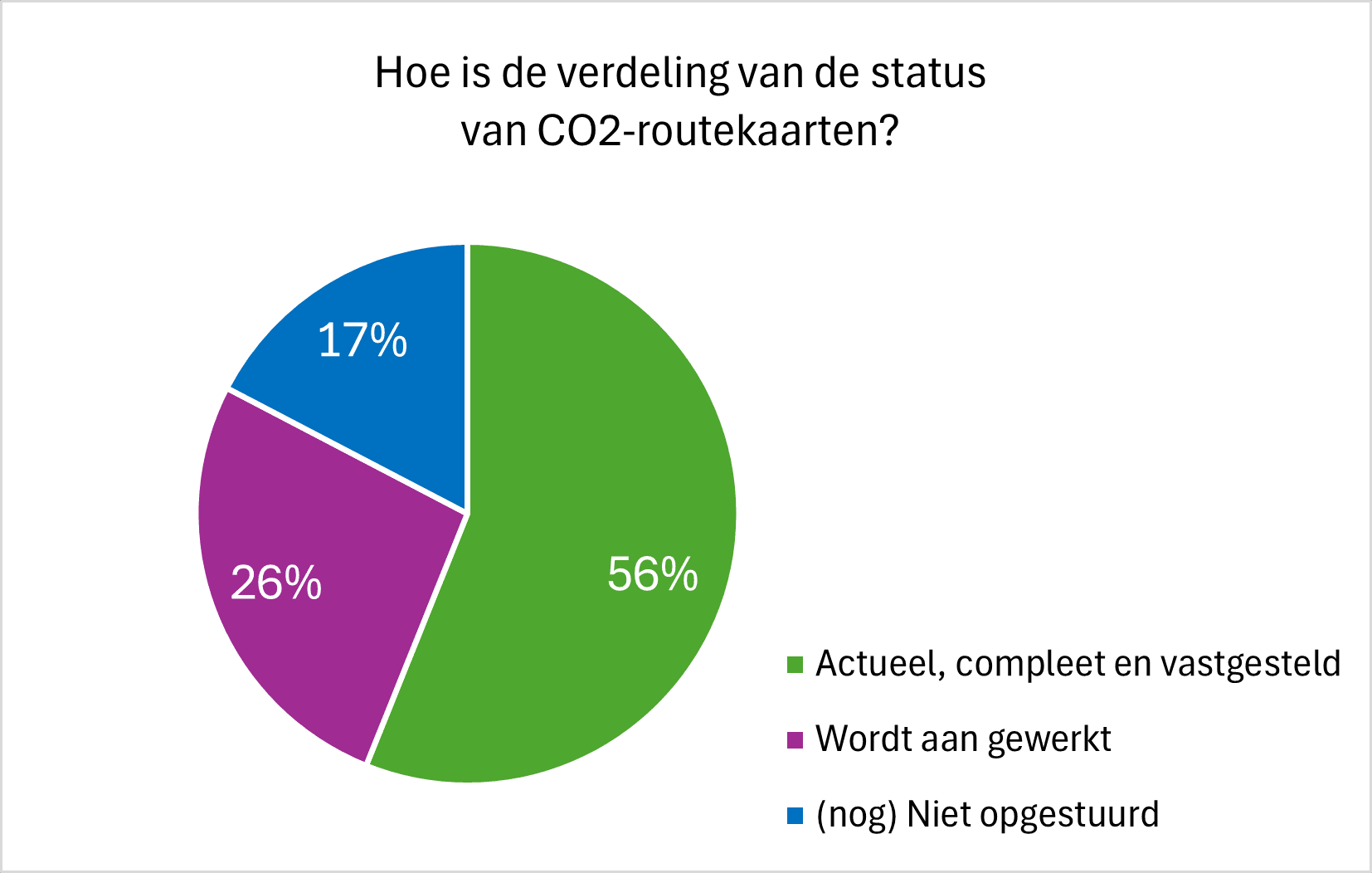Eind maart 2026 hebben 224 van de 271 grote care-organisaties* hun CO2-routekaart opgestuurd naar EVZ. Daarmee zijn de strategische verduurzamingsplannen van ruim 80% van die zorgorganisaties in beeld. Van de opgestuurde routekaarten heeft meer dan de helft (56%) de status groen: volledig, actueel en bestuurlijk vastgesteld. Dit is een stijging van 3 % ten opzichte van het vorige kwartaal. Het percentage paars (routekaart opgestuurd maar is niet helemaal compleet) is gelijk gebleven en van blauw (geen CO2-routekaart van ontvangen) is het afgenomen.