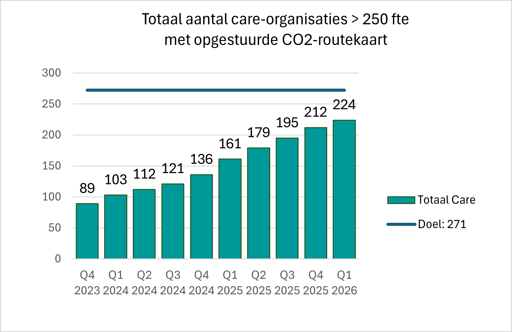 Aan het eind van het eerste kwartaal van 2026 hebben 224 van de 271 (grotere) care organisaties een CO2-routekaart opgesteld en opgestuurd naar EVZ. Er zijn dit jaar tot nu toe ruim 20 routekaarten binnengekomen. Ongeveer de helft hiervan zijn nieuwe routekaarten en de andere helft zijn updates, dus van organisaties die het document hebben geactualiseerd en/of aangevuld. Het totaal aantal organisaties met een CO2-routekaart is dit kwartaal met 12 toegenomen.
