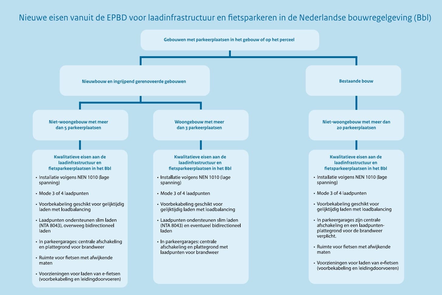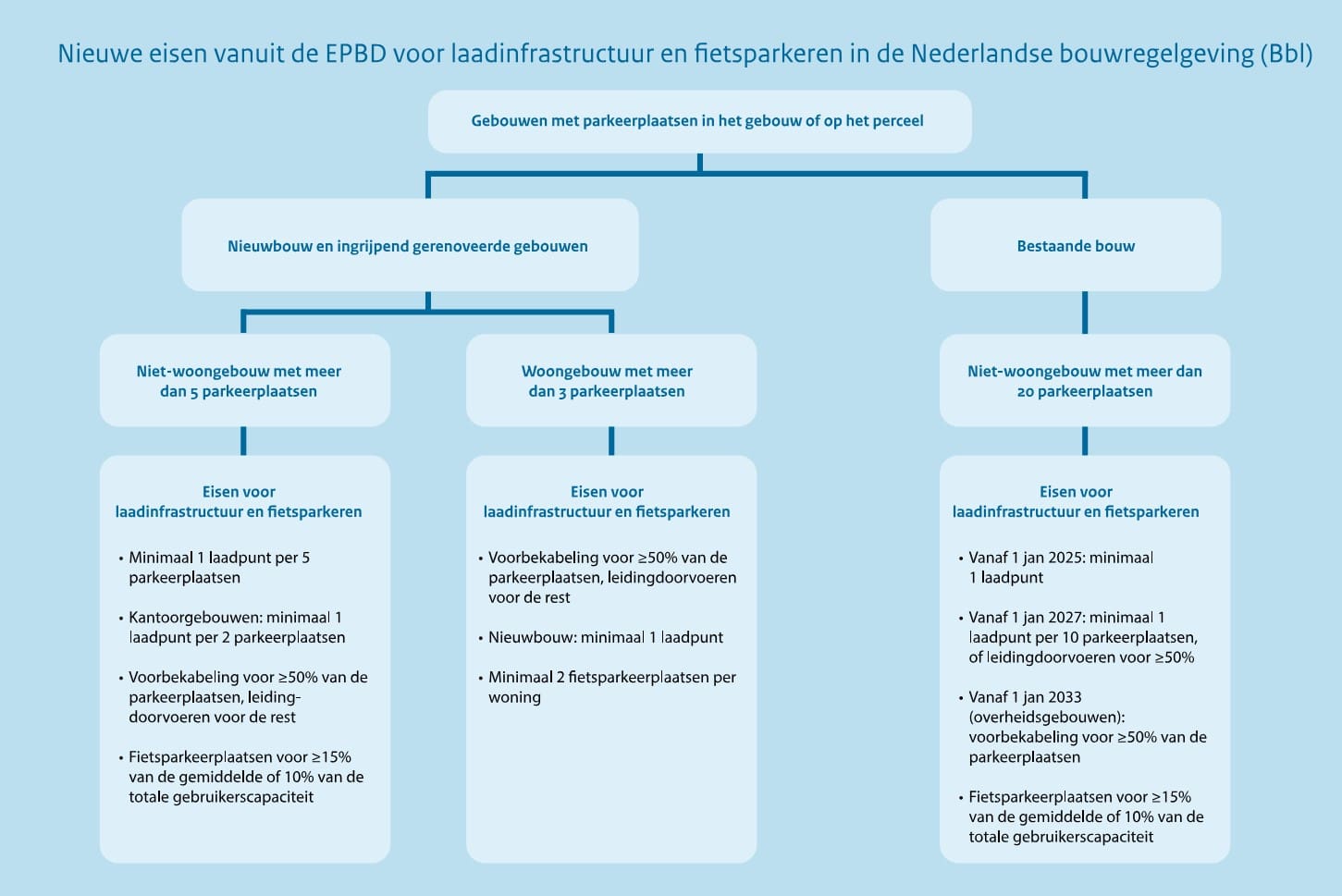 Met de invoering van de EPBD IV worden de eisen voor laadinfrastructuur de komende jaren verder aangescherpt. Daarnaast wordt op Europees niveau het gebruik van de fiets gestimuleerd door eisen te stellen aan het aantal fietsparkeerplaatsen bij een gebouw.
